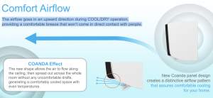 The airflow goes in an upward direction during COOL/DRY operation, providing a comfortable breeze that won’t come in direct contact with people. New Coanda panel design creates a distinctive airflow pattern that assures comfortable cooling for your home. The new shape allows the air to flow along the ceiling, then spread out across the whole room without any uncomfortable drafts, generating a comfortably cooled space with even temperatures.
